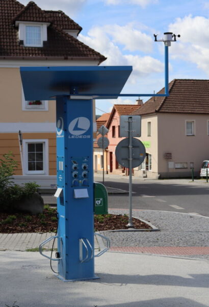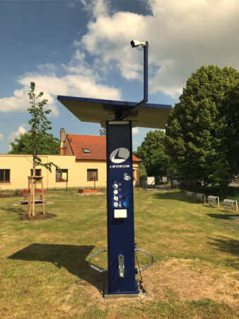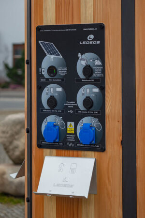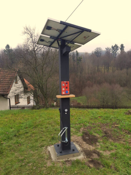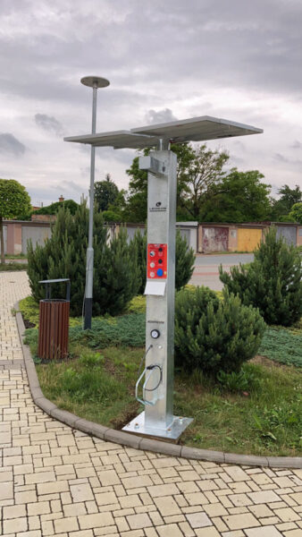 Tato jednoduchá varianta nabíjecí stanice je plně nezávislá na elektrické síti. Elektrický proud zajišťuje solární panel. Je možné ji zakomponovat do SMART CITY.
