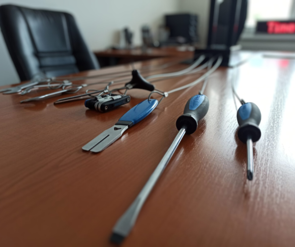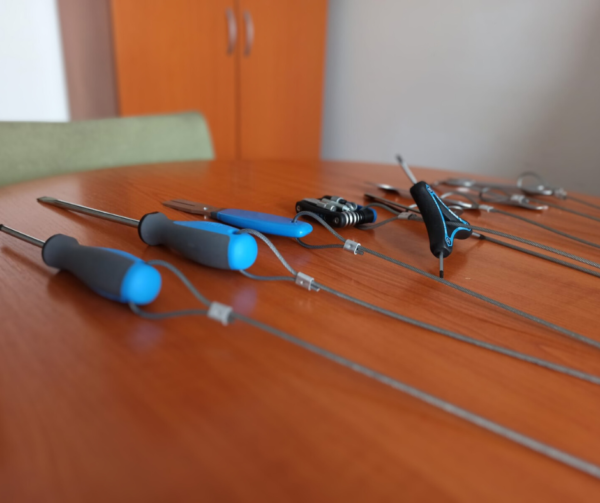 Sestava obsahuje 9 kusů nářadí včetně multifunkčních klíčů, na celkem 8 kusech ocelových lanek. Sestava nářadí je následující: